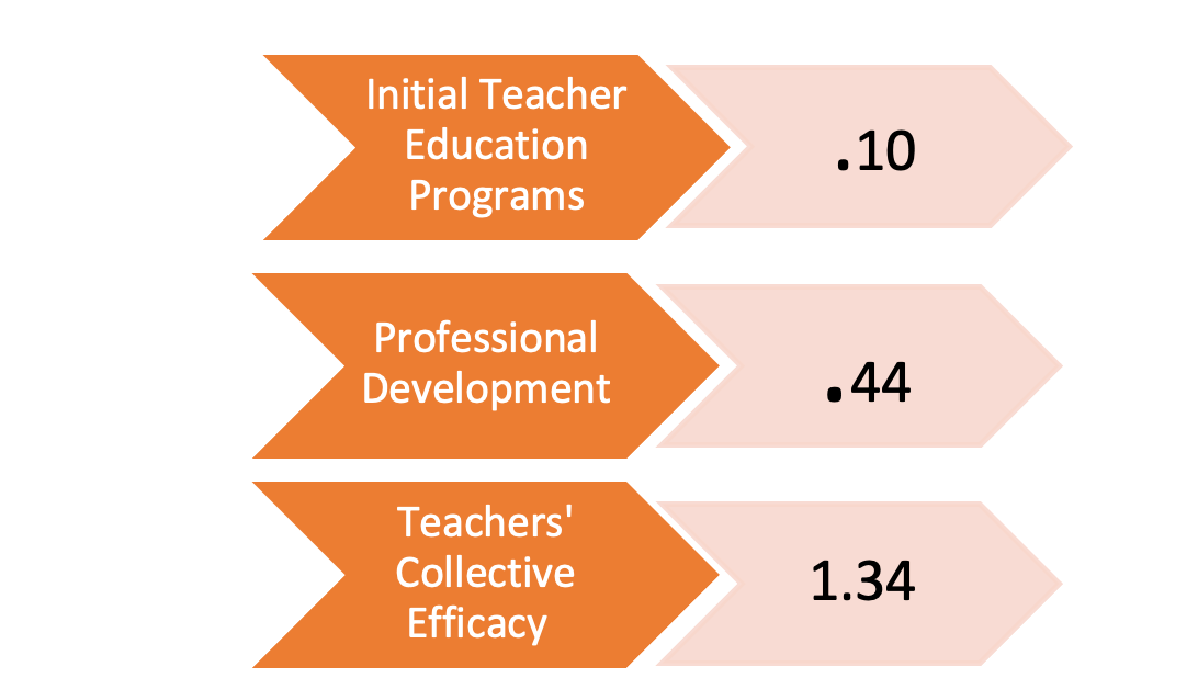 Based on this analysis, Initial Teacher Education Programs have little to no impact on student achievement with a Cohen’s d of .10. Cohen’s d demonstrates that Professional Development does have an impact on student achievement at .44. But most importantly, Teachers’ Collective Efficacy has the single highest effect size (1.3). Such practices reinforce the work of the Co-Plan to Co-Serve to Co-Learn (C3) Teams.